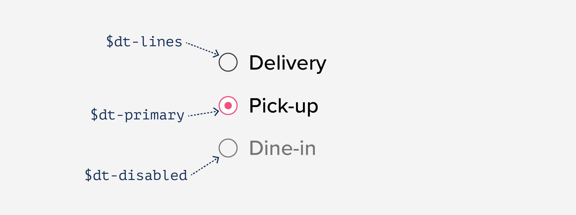 Notice that now instead of being prescriptive about the purpose of each color, the semantics of the variable names lean on describing the color. For instance, instead of the name $dt-disabled we use $dt-color__neutral--700.
